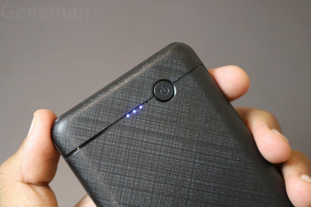 There is a small function button on the front side. Pressing the button indicates the remaining charge left using the LED indicators. Near the button, it has four LED indicators on the front that glows in Blue colour. These indicators show the remaining battery left when you are using it, and the remaining battery that needs to be charged when it is charging.